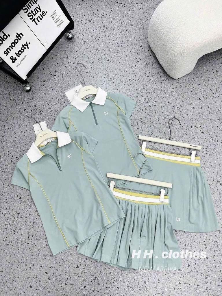 Bộ Wilson nữ - Áo + chân váy xanh mint phối viền vàng